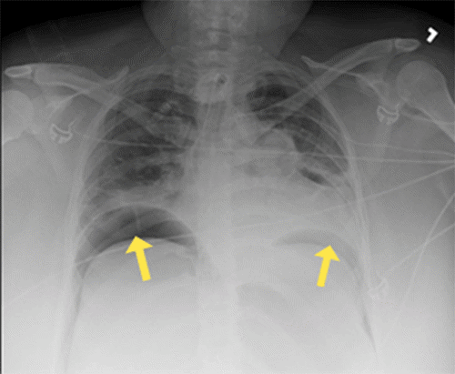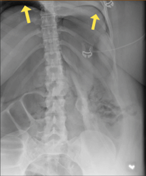 Within 30 minutes of arrival to the SICU, the patient’s abdomen was noted to be distended and firm. Her peak inspiratory pressures (PIP) were elevated, ranging between 55 to 60, and she was hypoxic with oxygen saturation in the 70s and 80s. Arterial blood gas (ABG) revealed a pH of 7.32, PaCO2 of 70, and bicarbonate level of 35. The PAO2/FiO2 ratio was 87. A chest X-ray (CXR) (Figure 1) showed the tracheostomy tube placed in the right mainstem bronchus. An urgent bedside tracheostomy exchange was performed by the ENT, replacing the tube with a shorter one. A subsequent CXR also revealed pneumoperitoneum, with free air observed under both hemidiaphragm, a finding that was confirmed by abdominal X-ray (AXR) (Figure 2).