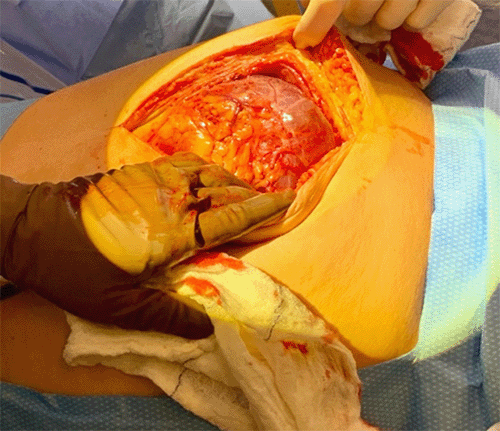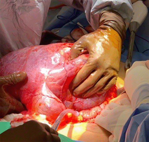 Following multidisciplinary discussion with radiology, medical oncology, and surgical oncology, written informed consent was obtained for open surgical exploration and excision of the abdominal mass. Upon laparotomy, a large, thin-walled cystic mass occupying the entire lower abdomen was readily identified (Figure 2). The lesion appeared intact without foul odor or evident fluid, suggesting no gross rupture. However, a localized inflammatory reaction between the mass and the left lower abdominal wall indicated possible ongoing perforation, which correlated with the patient’s clinical presentation and physical exam findings. Minor omental attachments were noted, but no gross invasion of surrounding tissues was observed. This allowed for blunt dissection and complete removal of the intact mass from the abdomen. The base of the lesion exhibited focal adherence to the antimesenteric border of the small bowel, approximately 15 cm proximal to the terminal ileum. In this location, the predominantly cystic mass harbored a small region containing solid components. Given the proximity to the small bowel and potential malignancy, an en bloc resection of the involved small bowel segment with subsequent standard small bowel anastomosis was performed. Exploration of the remaining abdominal cavity revealed no further abnormalities. The abdomen was closed in layers with staple closure of the skin incision.