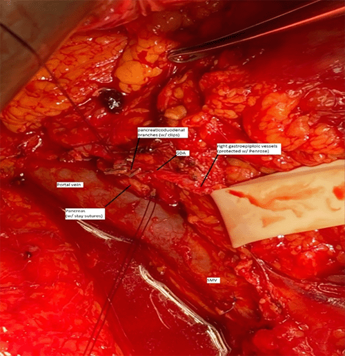 The GDA dissection was continued, revealing its bifurcation into the right gastroepiploic artery supplying the conduit. Intraoperative ultrasonography was repeatedly used to confirm anatomy and adequate blood flow to the conduit. Despite slight vasospasm, the pulse remained palpable, and the conduit was well-perfused. The gastroepiploic vessels were gently retracted leftward using a Penrose drain to protect the pedicle while tunneling between the pancreas and portal vein (Figure 4).