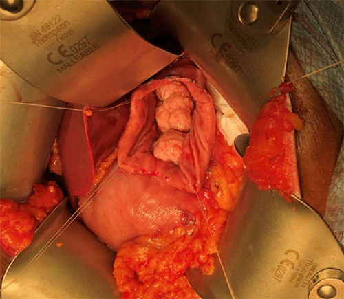 Figure 2. Multifocal Gastric Xanthoma Visualized Through Anterior Gastrotomy. Published with Permission