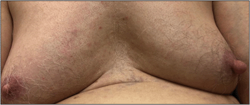 Figure 1. Preoperative Photograph Demonstrating Left Nipple Enlargement (1.5 × 1.0 × 1.0 cm) and Bilateral Gynecomastia. Published with Permission