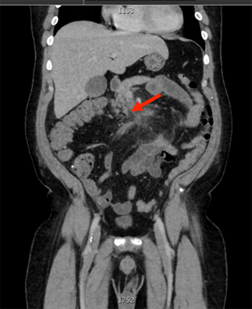 Figure 2. CT Scan Demonstrating Superior Mesenteric Vein (SMV) Thrombophlebitis. Published with Permission
