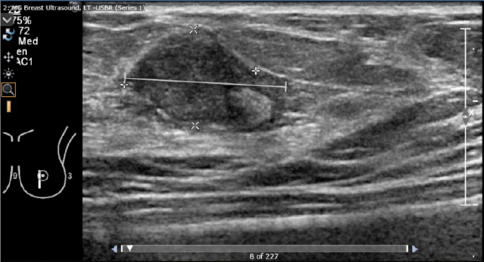 Figure 2. Breast Ultrasound Demonstrating 16 mm Abnormal Intramammary Lymph Node with Features Suggestive of Benign Etiology. Published with Permission