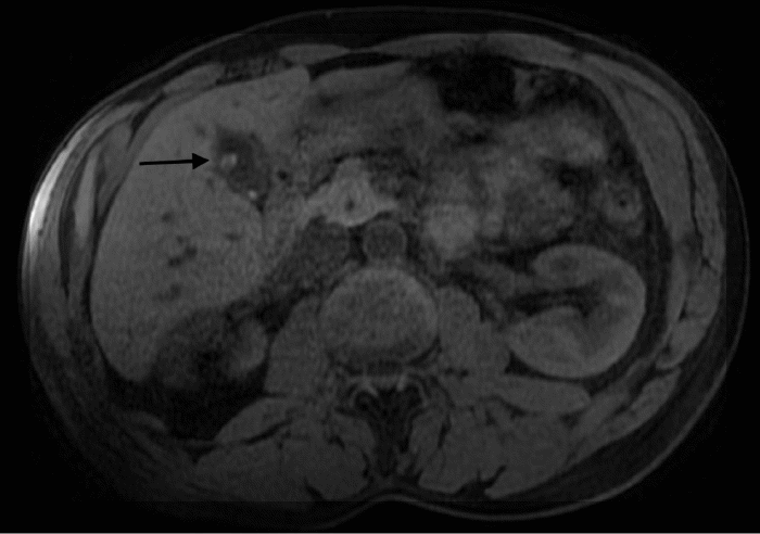 Clinically, the patient reported intermittent abdominal pain, which notably did not worsen postprandially. He denied any history of cholelithiasis, nausea, vomiting, diarrhea, melena, hematochezia, jaundice, or significant weight loss. His social history was significant for daily consumption of three to four cigars and previous heavy alcohol use (12 to 14 drinks per week). Physical examination findings were unremarkable, and laboratory investigations revealed no abnormalities. Based on the patient's symptomatology and the identified gallbladder mass, further diagnostic evaluation with magnetic resonance imaging (MRI) with and without contrast, supplemented by magnetic resonance cholangiopancreatography (MRCP), was pursued one month later. Multiplanar, multisequence MRI demonstrated an 8-millimeter, non-calcified, soft-tissue mass arising from the anterior gallbladder wall, consistent in appearance with a polyp. (Figure 1 and Figure 2). T2-weighted imaging confirmed this finding and also identified small superiorly located gallstones without overt gallbladder wall thickening. The MRCP component of the study yielded unremarkable findings regarding the biliary tree.
