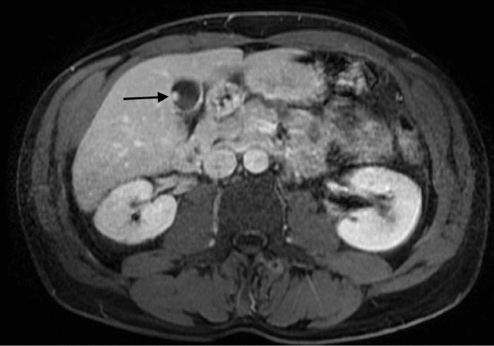 Figure 2. MRI with contrast with MRCP. Findings: Non-calcified soft tissue mass arising from the anterior wall of the gallbladder. Published with Permission