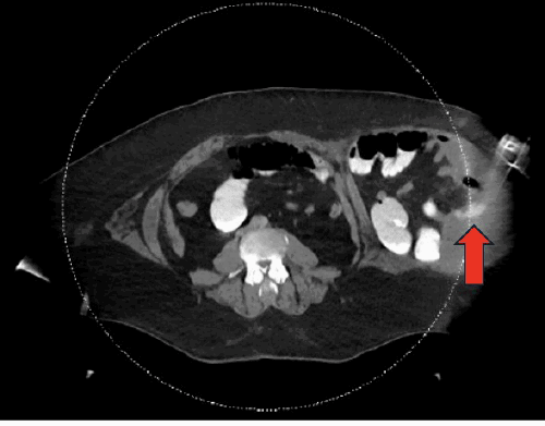 Figure 3. CT Demonstrating Extraperitoneal Bowel Perforation and Pleuro-Abdominal Communication. Published with Permission