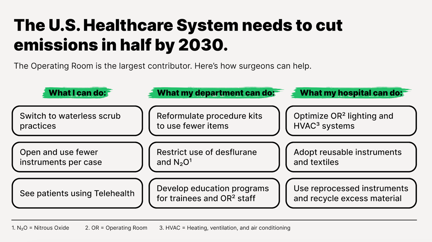 The healthcare industry contributes significantly to climate change and accounts for 8.5% of US greenhouse gas emissions.1 The destructive effects of climate change are well established and have a tangible impact on our patients. For example, increased pollution and extreme heat lead to substantially higher rates of asthma and cardiovascular disease.2 Changes in vector ecology lead to increased infectious disease incidence and unpredictability.2 Increasing severe weather events lead to food insecurity, morbidity, and fatality.2 In 2018, pollution from the US healthcare system cost 388,000 disability-adjusted life years.1 As surgeons and surgical trainees, it is our moral and ethical duty to not only understand how our decisions contribute to climate change, but also how to mitigate these impacts.