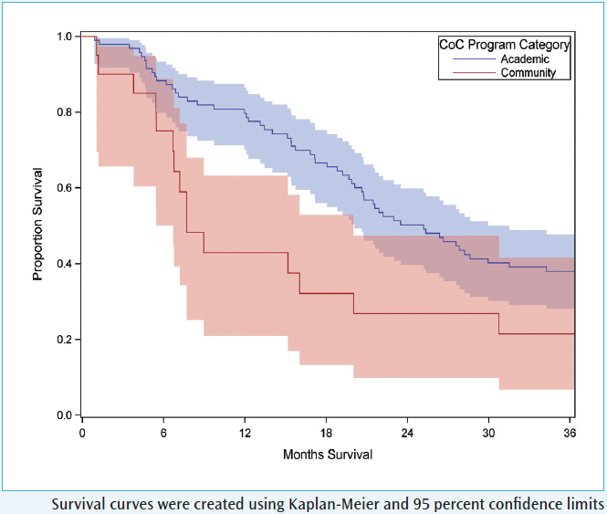 There are multiple possible causes of this difference; however, considering early separation of the survival curve and complex nature of the operation (Whipple), it could be directly related to outcome of the procedure. In addition, stage III intrahepatic cholangiocarcinoma—which was defined as a tumor that is large and exposed on the surface of the liver or invading a nearby organ—had better survival in the academic cancer program patient group compared with the community cancer program patient group (see Figure 2).9 Again, there was no statistical difference in three-year overall survival; however, there was a statistical difference in survival between six and 18 months (see Figure 2).
