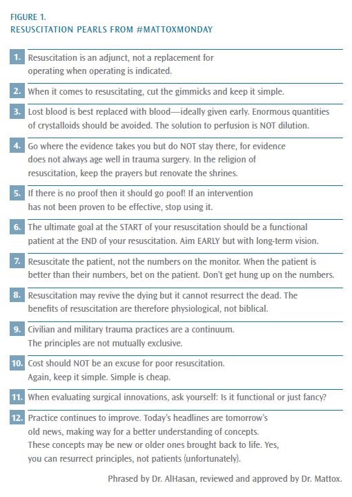 Summarizing information from discussions is a useful way to convert tacit knowledge into explicit knowledge that surgeons can apply in everyday practice. Figure 1 quotes slides posted following a Mattox Monday session on trauma resuscitation; points raised during the discussion were summarized into concise tips in simple language for followers to read and reflect on.