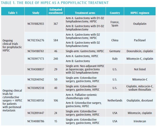 Several prospective trials seeking to better elucidate the role of HIPEC as a prophylactic treatment are under way as summarized in Table 1. For reference, prospective clinical trials evaluating the role of HIPEC in combination with cytoreductive surgery in patients with peritoneal disease are included in Table 1 as well. The ongoing GASTRICHIP (D2 Resection and HIPEC [Hyperthermic Intraperitoneal Chemoperfusion] in Locally Advanced Gastric Carcinoma) (NCT01882933) is a randomized trial comparing gastrectomy and HIPEC with oxaliplatin versus gastrectomy alone for advanced gastric cancer (T3, T4 and/or N+ and/or with positive peritoneal cytology). Estimated completion of this study is 2025.20