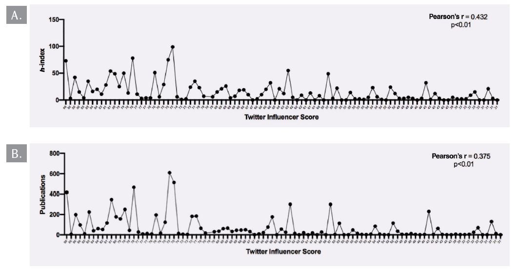 FIGURE 3. TWITTER INFLUENCER SCORE (December 7, 2020) Compared to (A) h-index and (B) total number of publications