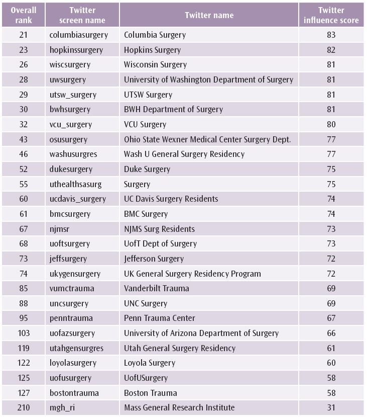 Unfortunately, we lacked the resources to identify topics discussed and what these influencers specifically added to the conversations; however, we believe that these influencers may have a significant impact on broad discussions in social media relevant to general surgery and health care. It is worth noting their presence and the roles they play in guiding these conversations.