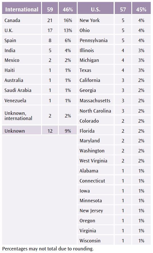 Overall, 44.5 percent (n = 57) of influencers were located in the U.S. compared with the previous 47.7 percent (n = 42), with 46.1 percent (n = 59) located internationally versus 51.1 percent (n = 45).2 The states with the highest number of social influencers included New York, Pennsylvania, and Ohio (see Table 1). The proportion of influencers from Canada decreased from 28.4 percent (n = 25) in February 2020 to 16.4 percent (n = 21), and the number of influencers in the U.K. increased to 13.3 percent (n = 17) in December from 5.7 percent (n = 5).2