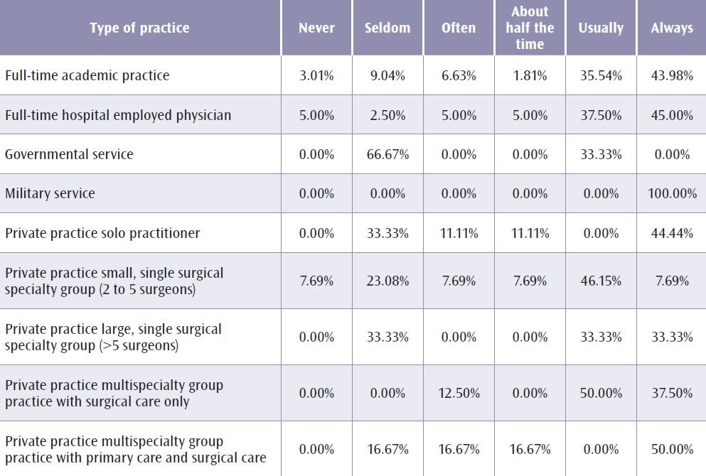 Examining the responses from different practice patterns revealed further insights. For example, Governors in military service reported that 100 percent of physicians under investigation for possible disciplinary action were granted due process. In contrast, surgeons in civilian private practice reported that 20−30 percent of the time due process is never or seldom observed. Civilian private practitioners also reported that 20−30 percent of the time physicians were not informed they were being investigated.