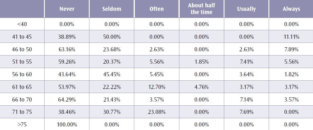 Although most Governors (76 percent) believed that physicians under investigation for possible disciplinary action were given due process, 17 percent of Governors ages 61 to 65 believed due process was never or seldom followed. Most Governors (78 percent) believed that physicians under investigation were informed that they were under review, but 21 percent of Governors ages 61 to 65 reported this information was never or seldom shared, versus 68 percent of the YFA leadership who believed that physicians under investigation were informed. Most Governors (83 percent) reported they never or seldom witnessed an abuse of the peer review process in the last five years, but Governors ages 46−50 years old and 66−70 years both usually reported this abuse 11 percent of the time (see Table 2). In comparison, 18 percent of the YFA leadership reported they had witnessed abuse.