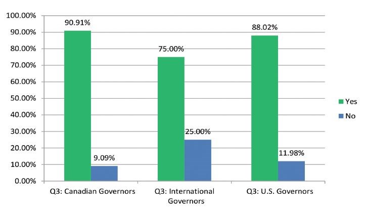 Several interesting differences were noted when analyzing responses based on geographic location. For example, only 9 percent of both Canadian Governors and U.S. Governors reported that physicians under investigation for possible disciplinary action were never or seldom given due process, while 28 percent of international Governors reported this right was never or seldom granted. Another discrepancy was found when comparing access to information relevant to their case. Similarly, 25 percent of international Governors reported they were never or seldom provided access to relevant information versus only 9 percent of the Canadian Govenors and 13 percent of the U.S. Governors.