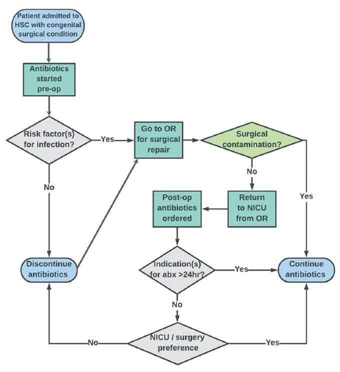 The NICU at The Hospital for Sick Children serves as the quaternary NICU for a catchment area of 75,000 annual births in Ontario, Canada. The unit has 38 beds, with 800 admissions annually, among which approximately 350 have a primary admission diagnosis of a surgical condition, and 10–20 surgical procedures are performed monthly. This quality improvement (QI) project aligned with our corporate QI plan to improve antibiotic prophylaxis after surgery. Discontinuation of routine use of antibiotics for prophylaxis against surgical site infection (SSI) after leaving the operating room (OR) was among the hospital’s own 2017 Choosing Wisely Canada list of five questions physicians and patients should consider.13,14