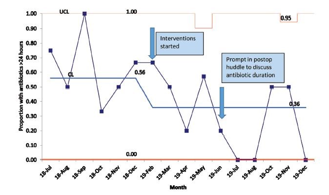 Outcome and process measures were evaluated on statistical process control charts. Signals, indicating special cause, were identified using standard control chart rules.22 Descriptive statistics were used to describe baseline data. To compare data from the baseline and postintervention periods, the chi-square test for proportions (proportion with discontinuation of antibiotics with 24 hours postoperatively) was used, and the Mann Whitney U test was used for non-normally distributed continuous variables (duration of antibiotics).