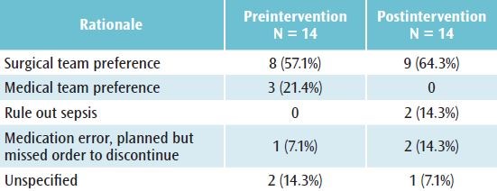 We evaluated 64 neonates who had clean or clean-contaminated congenital GI surgery over an 18-month period with 25 in the preintervention period (July 2018 to December 2018) and 39 in the postintervention period (February 2019 to December 2019). The proportion of neonates who received prophylactic antibiotics more than 24 hours postoperatively decreased from 56 percent (14/25) to 36 percent (14/39) in the pre- and postintervention periods, respectively (p = 0.114). The reasons for continuing antibiotics for more than 24 hours are summarized in Table 1. The duration of prophylactic postoperative antibiotics decreased from a median of 41 (24, 48) hours to 18 (16, 41) hours in the pre- and postintervention periods, respectively (p = 0.01).