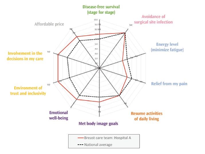 Figure 3 illustrates a radar plot for the patient’s breast cancer to graphically summate the various dimensions that both the patient and their care team could use to apply judgment. What is included on the radar plot will be chosen by the patient’s multidisciplinary team based on what matters to the patient alongside what the clinical team must track to deliver on patient goals and ensure patient safety. Appendix 1 considers dimensions to include on a radar plot, using breast cancer as the hypothetical example. Applying judgment requires the use of metrics to assess how well the care team did on delivering value to the patient. The plot is scaled from 0 to 10, where 0 is the worst performance, and 10 is the best—for all axes, the further from the center, the better. In Figure 3, Hospital A is compared against the national average for breast cancer, allowing for cancer teams to see how they compare with their peers. The radar plot indicates that Hospital A is above the national average for the following: disease-free survival in breast cancer, meeting patients’ body image goals, patients’ emotional well-being, creating an environment of trust and inclusivity, and involving patients in the decisions of their care. Hospital A is at the national average for SSI and for patients to resume activities of daily living, and just below the national average for relieving pain and minimizing fatigue. Hospital A delivers this care at a more affordable price than the national average.