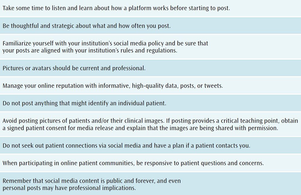 Medical information doubles every 73 days, and the path to learning is no longer a straight line.7 New data from clinical trials, published studies, and scientific meetings can be shared on a social media platform such as Twitter using individual tweets, tweet chats, Twitter conferences, and online journal clubs, which allow people with similar interests and/or backgrounds to connect quickly, creating an immediate, ongoing dialogue. Similar data-sharing practices are seen on Facebook and Instagram. Newer social media platforms, such as Clubhouse, also are being used by physicians for networking and professional discussion. Professional use of social media in medicine can be optimized with several strategies; however, while impactful, social media use is accompanied by risk. Best practices for optimization and risk mitigation (see Table 1) have been shown to be effective for surgeons who have paved the way.8