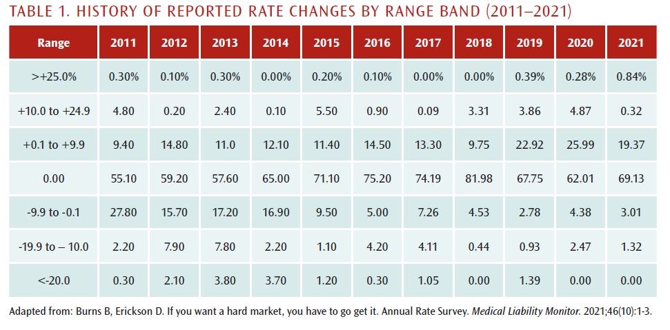 However, perhaps more impactful in the stabilization evident in the overall pattern of rate movement is the percent of reported rates that remained flat in 2021 compared with the previous 2 years—69.13% of rates in 2021 remained flat versus 62.01% in 2020 and 67.75% in 2019. The 2021 report also noted that fewer reported rates decreased than in either of the 2 previous years—4.32% in 2021 versus 6.85% in 2020 and 5.1% in 2019.9 See Table 1 for a listing of the 10-year history of reported rate changes displayed by range band.