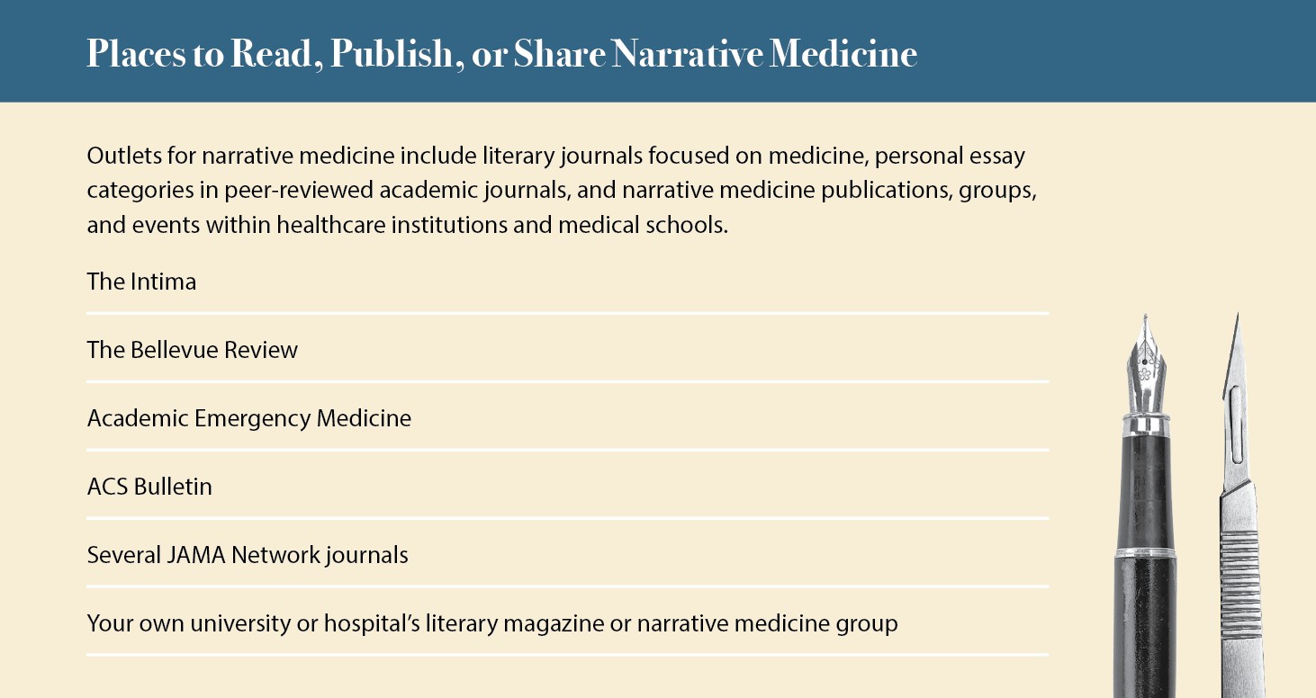 The concept of narrative medicine was popularized by internal medicine physician and English professor Rita M. Charon, MD, PhD,4 about 20 years ago. With colleagues at Columbia University in New York, New York, she generated a framework to clarify the characteristics that define narrative medicine: “We early recognized attention, representation, and affiliation as the three movements of narrative medicine that emerged from our commitment to skilled listening, the power of representation to perceive the other, and the value of the partnerships that result from narrative contact.”5