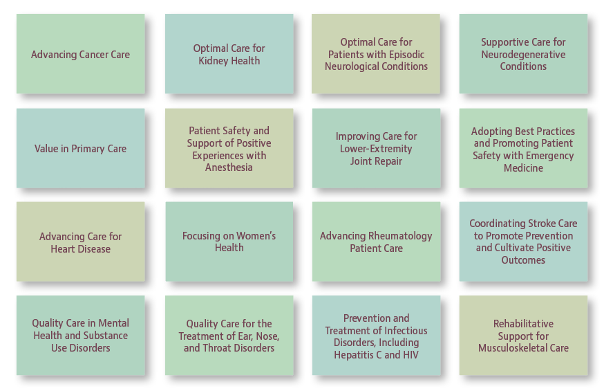 If a surgeon chooses to participate in an MVP, he or she must register to participate in this pathway and select quality measures and IAs from the MVP to report. CMS automatically calculates the cost and population health measures associated with the MVP using administrative claims measures. A clinician or group is only scored on these measures if enough patients are attributed under each measure (similar to traditional MIPS). For the 2024 performance year, clinicians can choose from 16 MVPs as shown in Figure 1 below.