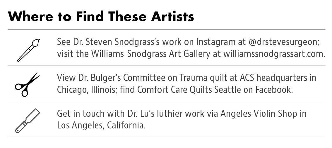 Very few studies seem to have investigated not just art, but craft. While some surgeons create two-dimensional fine art, other examples of current practitioners are in fact artisans: violinmaker Daniel C. Lu, MD, PhD, for example, or quiltmaker Eileen M. Bulger, MD, FACS, Medical Director of ACS Trauma Programs.