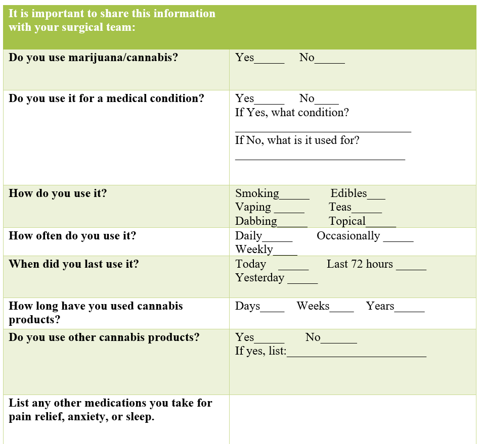 You should discuss with your surgical team if you are using any form of marijuana or cannabis products. It can affect the outcome of your surgery. It is recommended to stop using marijuana products 72 hours before surgery.