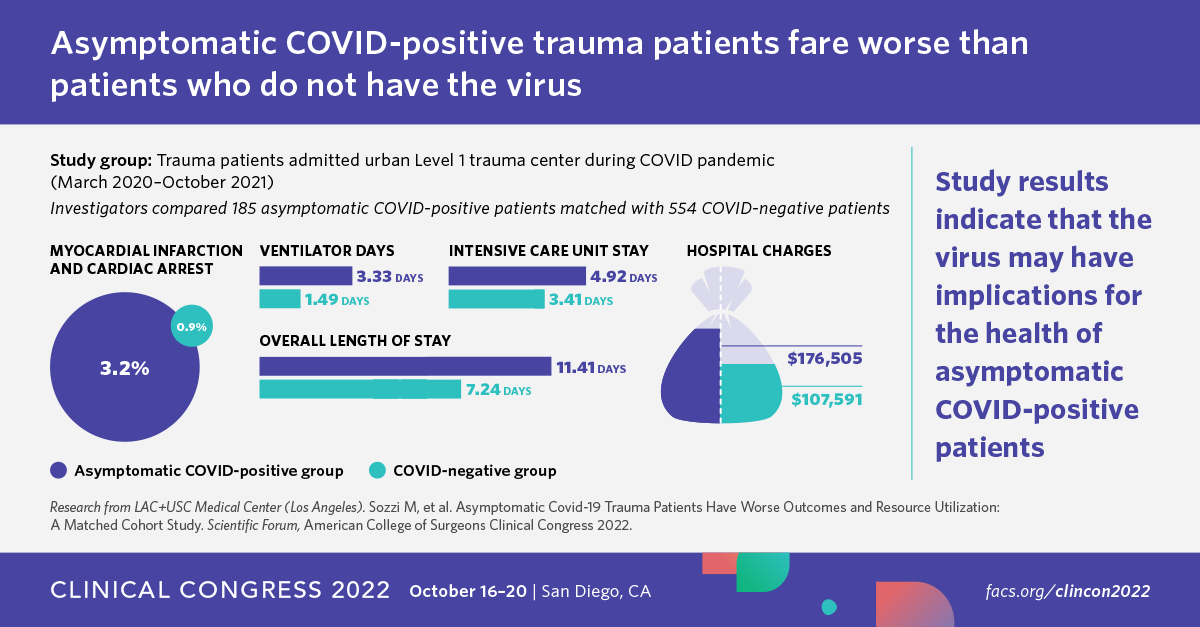 SAN DIEGO: Trauma patients who show no symptoms for COVID, yet test positive for the virus, have significantly higher rates of cardiac events, stay in the hospital longer, and incur higher hospital charges than do similar trauma patients who test negative for COVID, according to study results presented during the Scientific Forum at the American College of Surgeons Clinical Congress 2022.