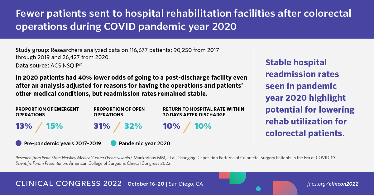 Citation: Mankarious MM, et al. Changing Disposition Patterns of Colorectal Surgery Patients in the Era of COVID-19. Scientific Forum Presentation, American College of Surgeons Clinical Congress 2022