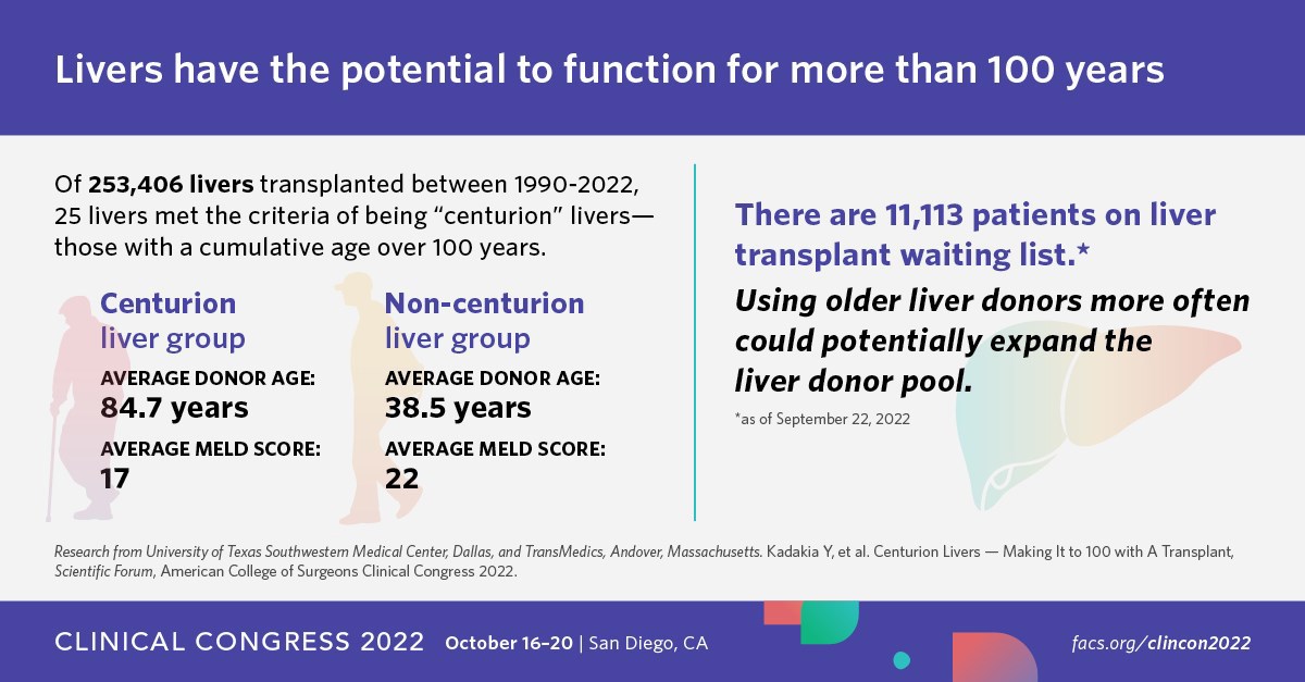 Citation: Kadakia Y, et al. Centurion Livers — Making It to 100 with A Transplant, Scientific Forum, American College of Surgeons Clinical Congress 2022.