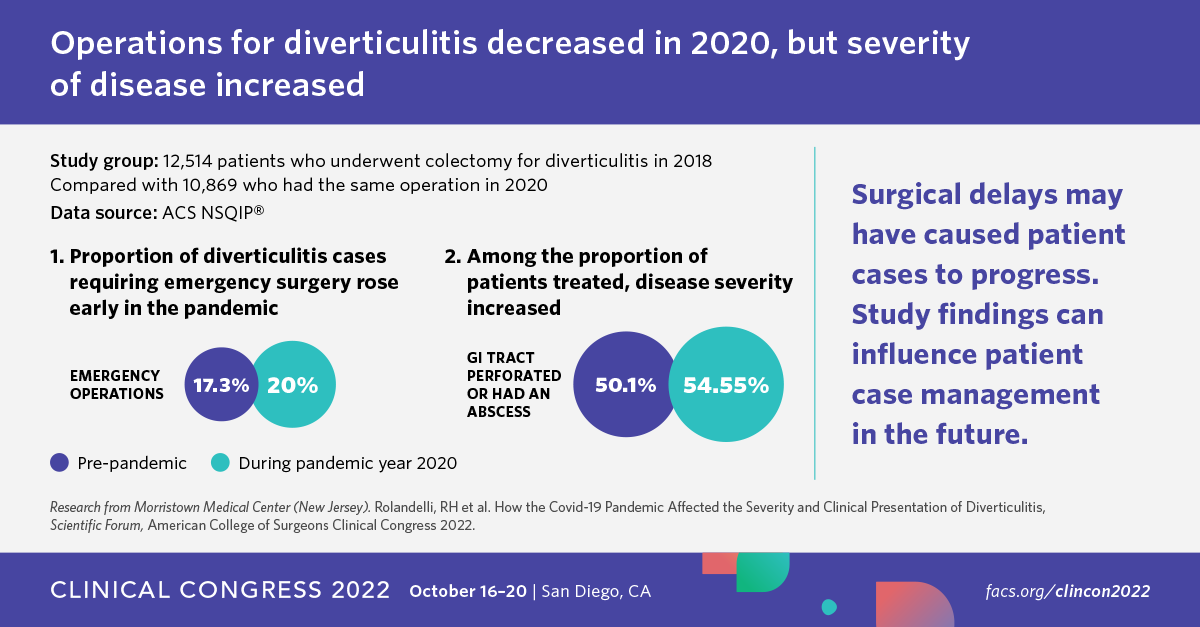 Citation: Rolandelli, RH et al. How the Covid-19 Pandemic Affected the Severity and Clinical Presentation of Diverticulitis, Scientific Forum, American College of Surgeons Clinical Congress 2022.