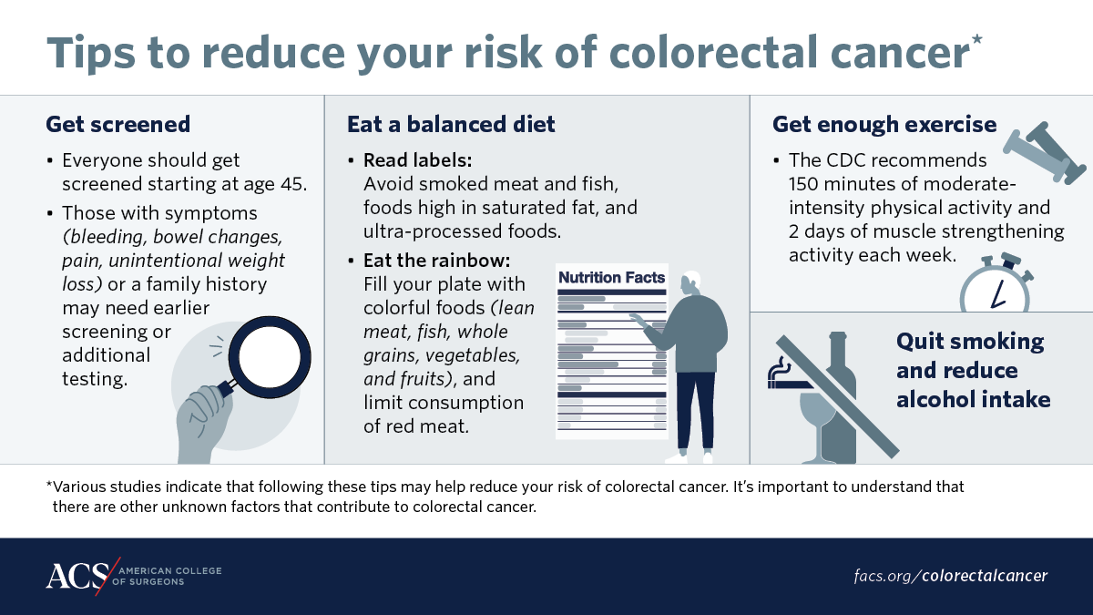 Screening for colorectal cancer saves lives, and should begin at age 45 for people at average risk of developing colorectal cancer, according to guidelines issued by the U.S. Preventive Services Task Force. People with a family history of colorectal cancer should be screened 10 years earlier than the youngest age of diagnosis in their family.