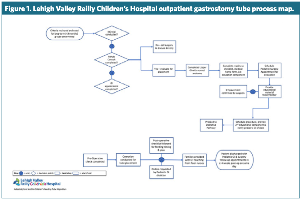 In preparation for the project implementation, various elements were created by the team. A gastrostomy tube placement checklist was developed to ensure patients had completed their visits with GI, developed feeding plans, completed an NG trial, and had a medical team/support in place prior to surgery consult for GT placement. A medical plan form was also developed, and it contained components of admission information, nursing care, nutrition plans, social work, surgery, and upcoming appointments to assist families and the medical team in coordination of care. Both inpatient and outpatient process maps were developed and approved by key members. These maps addressed the evaluation process prior to GT placement, the operative pathway, post-operative follow up, and the removal process. These essential planning documents were uploaded onto a network-wide drive for full access and utilization by providers. They were integrated into the electronic medical record system as needed.