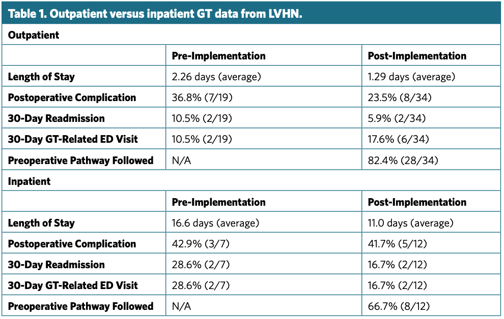 Inpatient LOS was decreased from 16.6 days to 11 days on average, with many patients having prolonged NICU stays after placement. Postoperative complications, readmissions, and GT related ED visits were all decreased in this cohort (Table 1). The preoperative pathway was followed in 58.3 percent of cases.