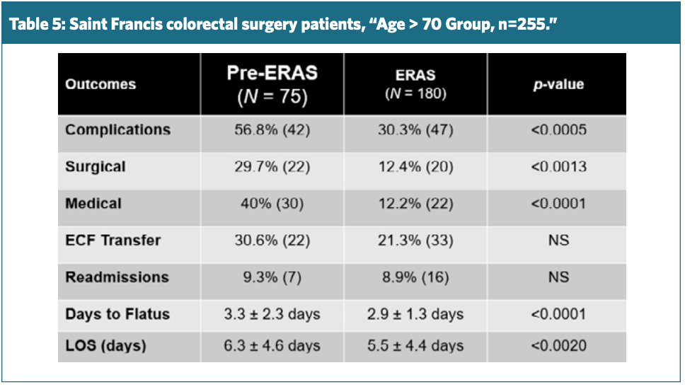 Comorbid patients (n=237; Table 3) and patients with diabetes (n=139, Table 4) both demonstrated identical improvements (p<0.001). Patients with advanced age (n=255, Table 5) improved significantly with respect to surgical and medical complications, days to flatus, and hospital LOS (p<0.001).