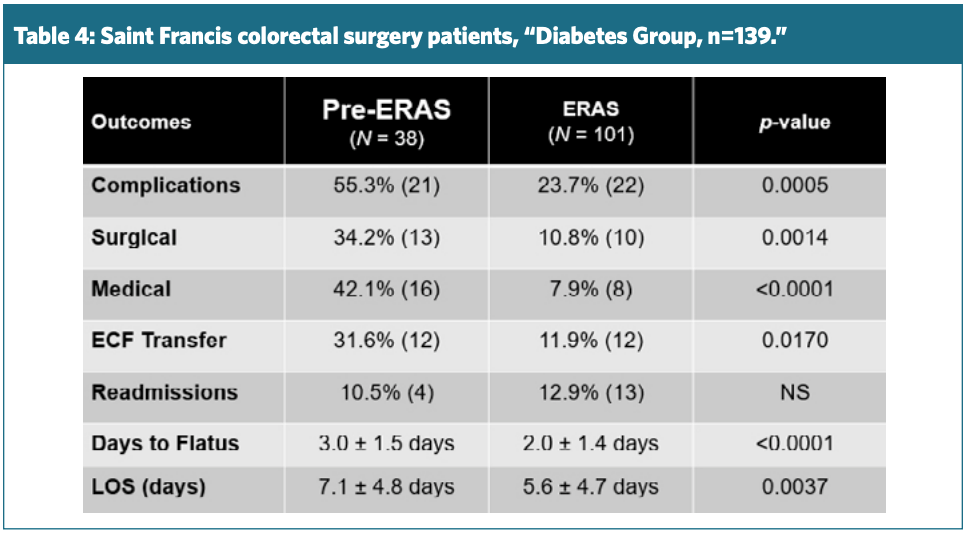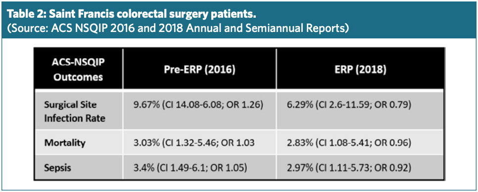 We targeted improvement in these events in an effort to enhance the patient experience and sought support from the private foundation of a medical professional liability provider, who found interest in our preliminary work. With their support, Saint Francis was able to obtain a large grant to support enhanced recovery programs, and, in collaboration with the American College of Surgeons local chapter, supported the ERP efforts statewide and at Saint Francis. More recently, further efforts to focus ERP on more frail populations (patients with diabetes, patients older than 70 years, and patients with American Society of Anesthesiology Classification [ASA] >2) have been endeavored. Perioperative optimization in these patients has resulted in similar improvements in outcomes.