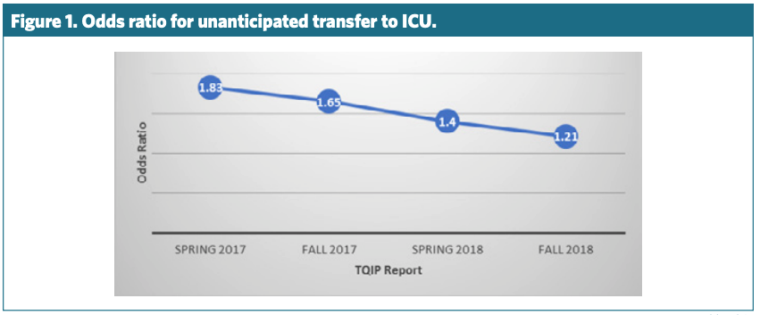 Complete protocol development, “go-live,” and implementation took approximately 12 months. We introduced each step incrementally, first focusing on appropriate triage, next on multimodal pain control, and finally with pulmonary hygiene and improved documentation. Our primary outcome was rate of unplanned ICU admission. Over the course of one year, OR of unplanned transfer decreased from 1.83 to 1.21 (Fall 2018), with incremental improvement each quarter (Figure 1).