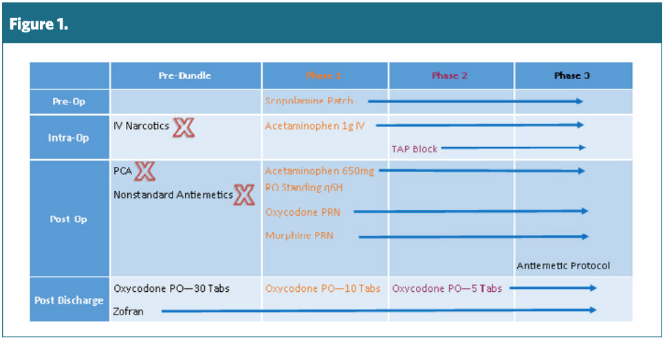 Prior to implementation of our protocols, all patients followed a standardized care pathway. This pathway included routine use of patient-controlled anesthesia, discharge on oral narcotics, and an inpatient order set for nausea, which was written with minimal guidance or education for the administering nurses.