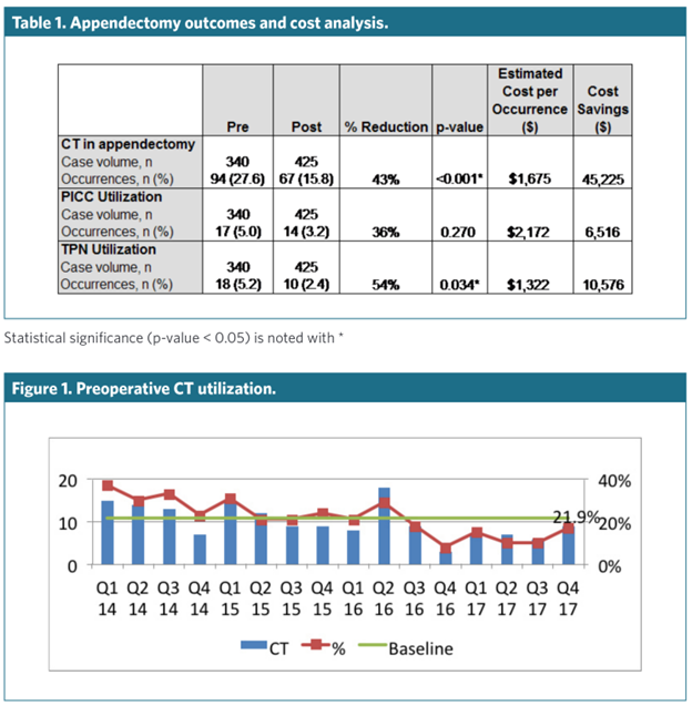 As mentioned previously, CT utilization reduction was the primary goal of the appendectomy pathway. However, in analyzing the appendectomy data for this project, we also noted a decrease in PICC and TPN utilization. As providers at GCH provide evidence-based care to patients, it can be speculated that the decrease in PICC and TPN utilization during this project may be attributed to this. Current literature supports transitioning patients from IV to oral antibiotics prior to discharge, which is the current practice at GCH, may have attributed to the decrease in PICC utilization as well as the decrease in TPN utilization.10 Length of stay (LOS) in appendectomy patients has also decreased at GCH, which may also be attributed to the reduced resource utilization.