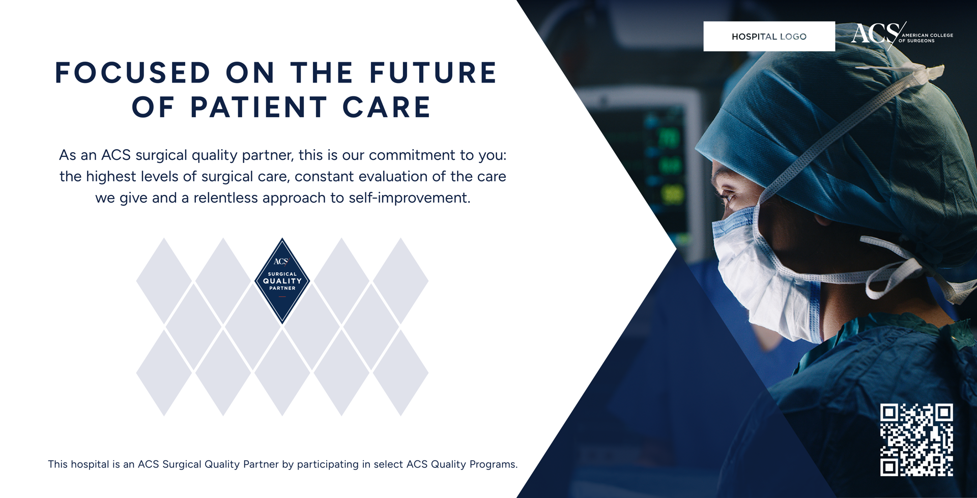 The SQP store provides additional products you can order to promote your SQP status and a toolkit of digital marketing resources that your hospital can use to promote your designation on your website and social media platforms, across the walls of your hospital and in paid media. These files are ready to use and can be customized easily with your hospital logo. These are assets that showcase your status as an ACS Surgical Quality Partner by participating in at least one of 13 ACS Surgical Quality Programs. These include: